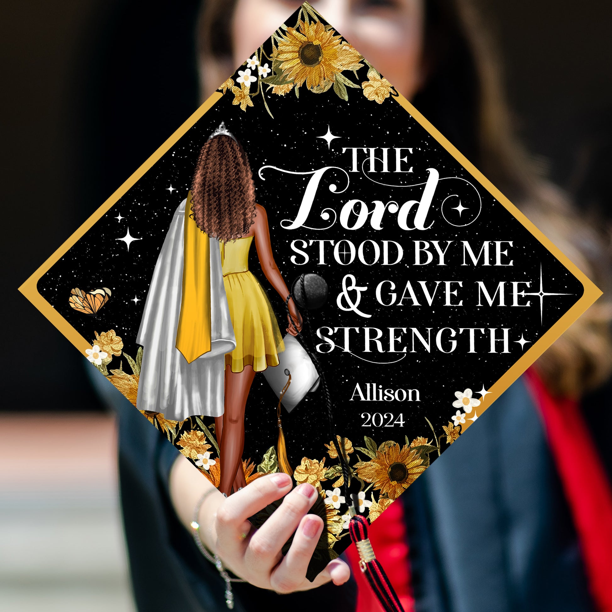 Custom Christian Graduation Cap Topper, The Lord Gave Me Strength Sunflower Grad Cap Decoration, Personalized Black Girl Grad Cap Topper