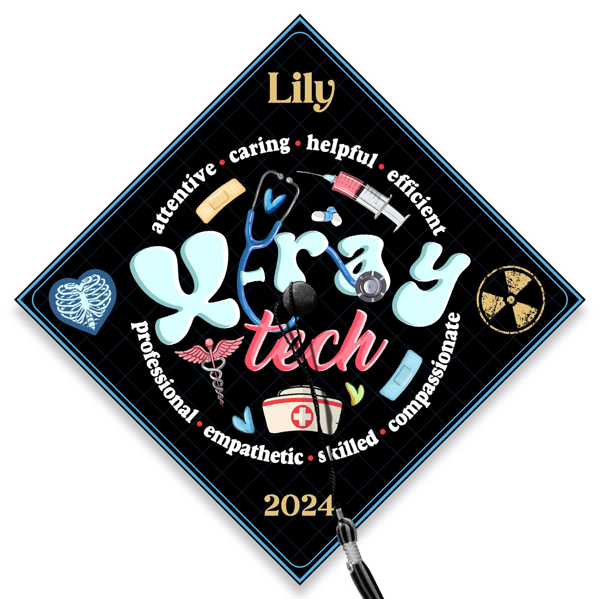 Celebrate your accomplishments as a radiologic technologist with our stunning graduation cap topper! Crafted from high-quality materials, our rad tech graduation cap topper is designed to withstand the excitement of graduation day and beyond. Its sturdy construction and secure attachment ensure that your topper stays in place, allowing you to proudly showcase your achievement as a radiologic technologist. Commemorate your journey into the world of radiologic technology with our photo-friendly rad tech cap topper.